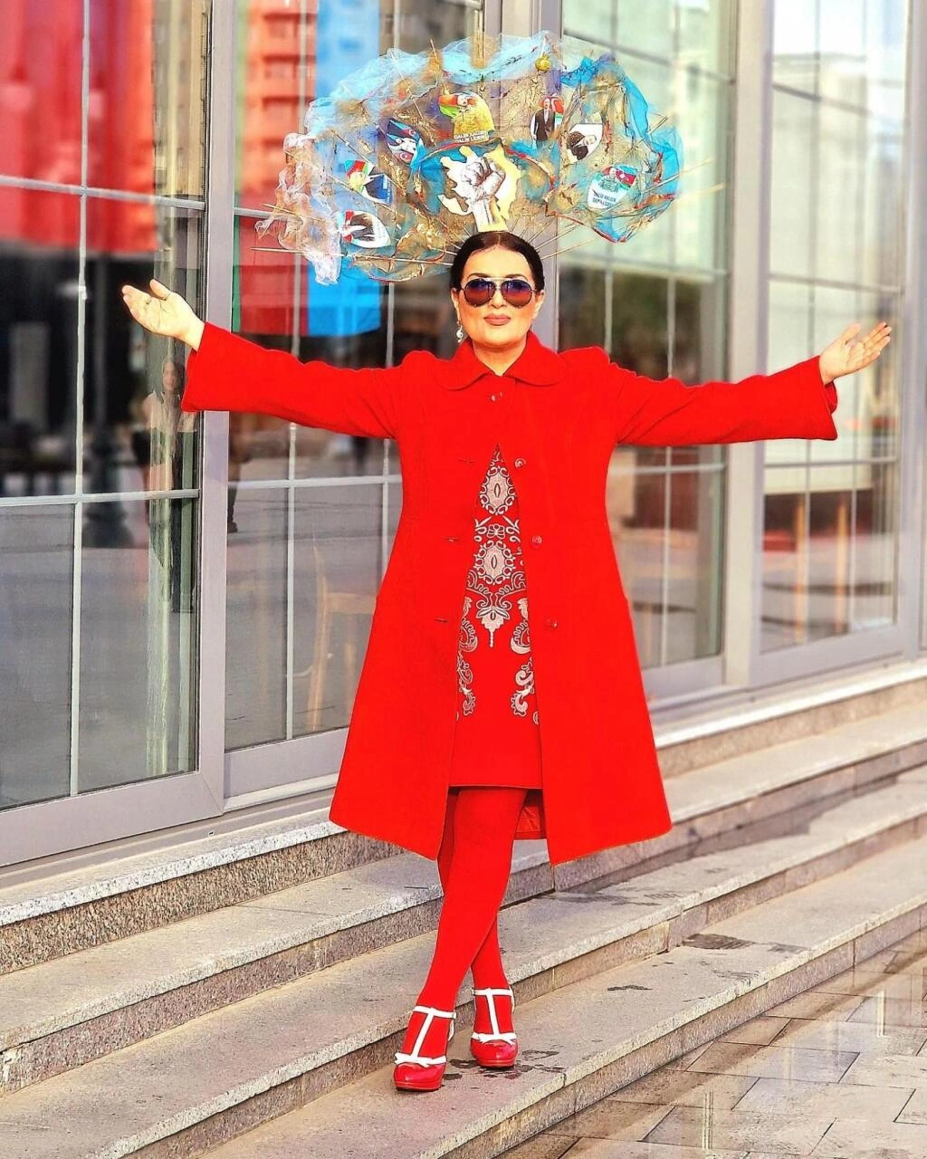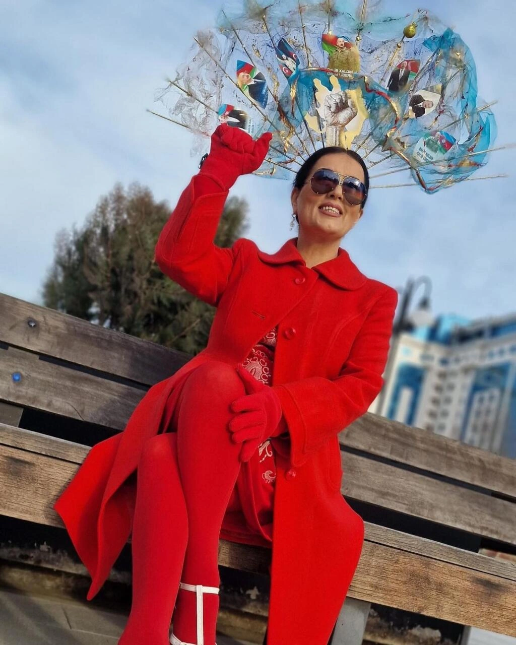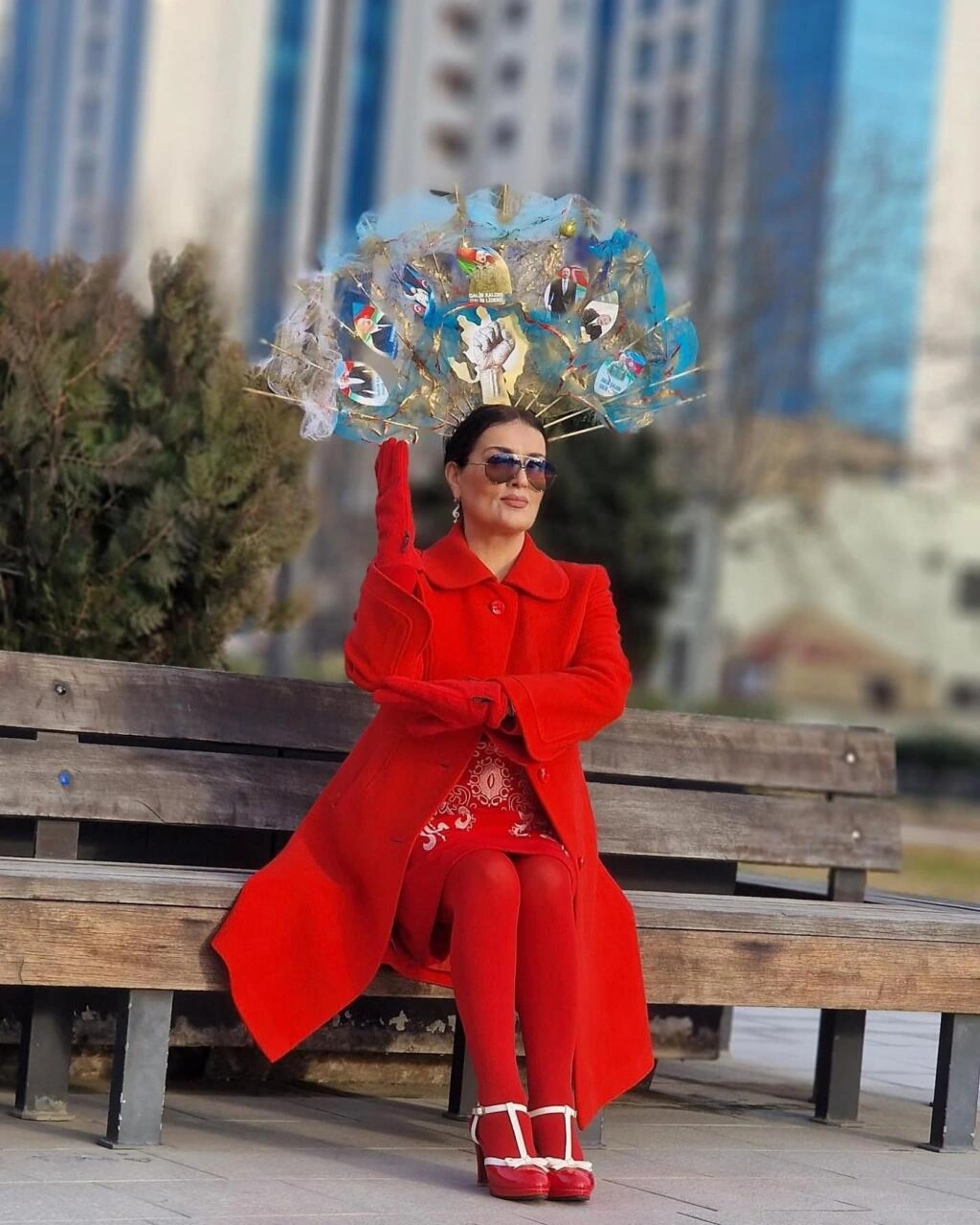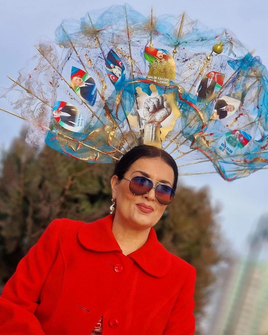 E.Seyidcahan qırmızı dəstini başındakı tacla tamamlayıb. O, Ölkə başçısı İlham Əliyevin fotolarının yer aldığı böyük aksessuar düzəltdirib.