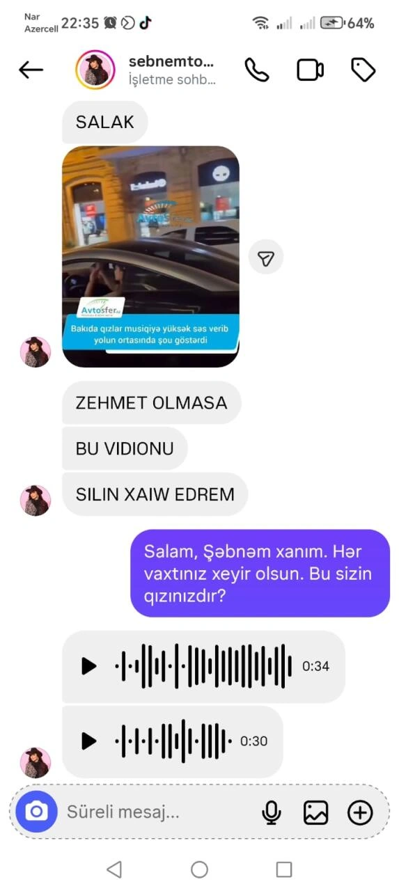 Milli.Az xəbər verir ki, kadrlarda onların yüksək səslə musiqi dinlədiyi, təhlükəsizlik kəmərindən istifadə etmədiyi və sürücünün sükan arxasında əllərini buraxaraq çəkiliş apardığı görünür. Sözügedən paylaşımı isə sosioloq Lalə Mehralı edib.