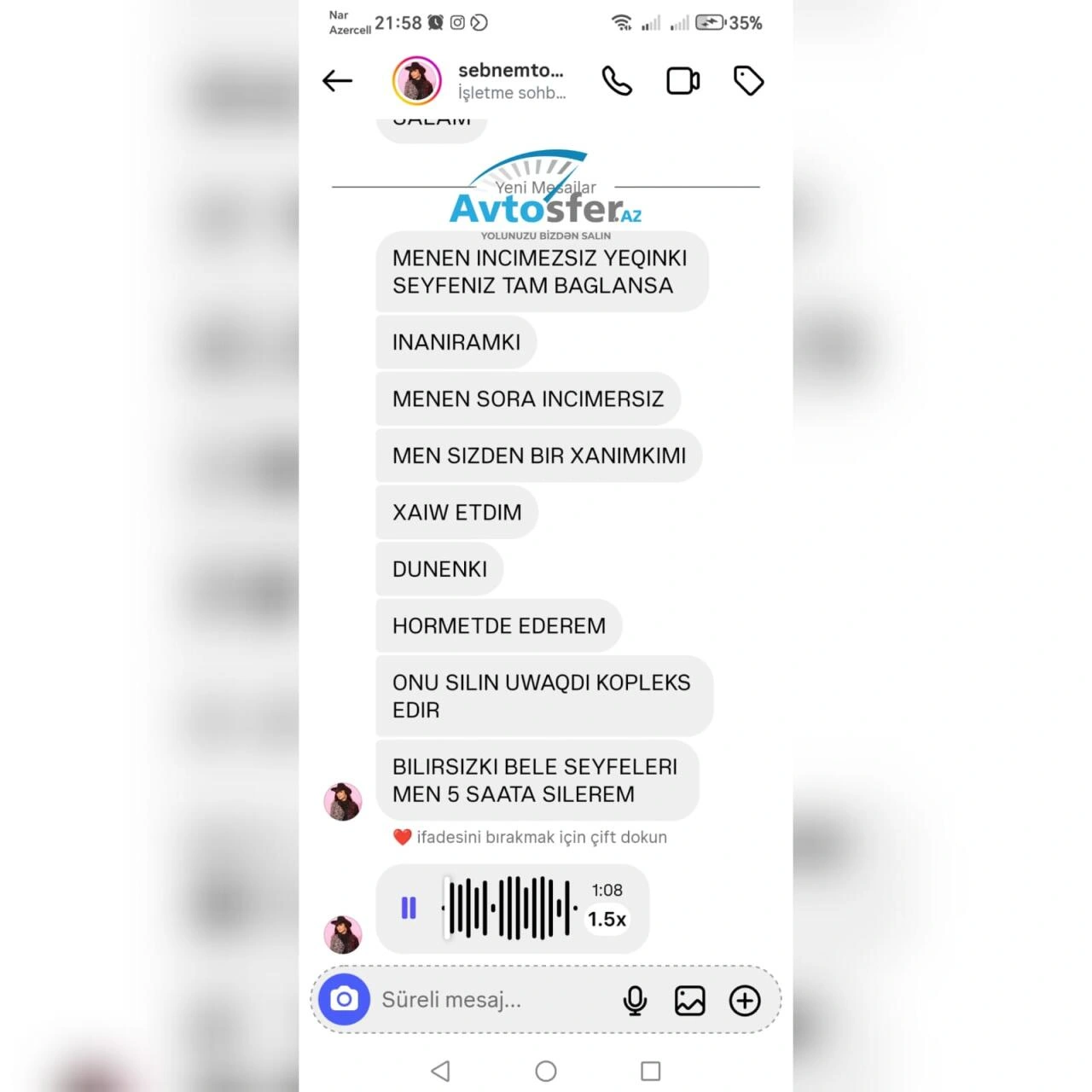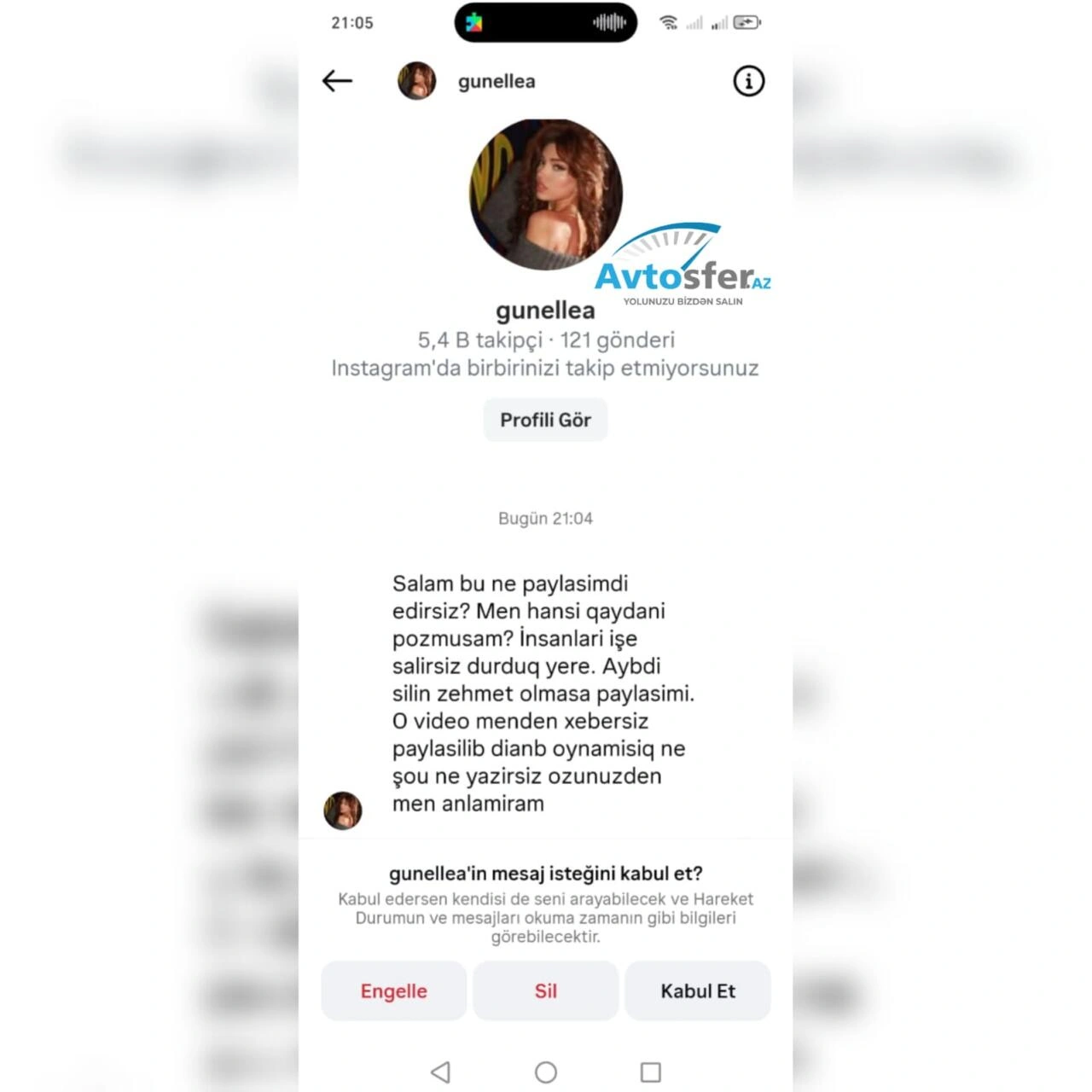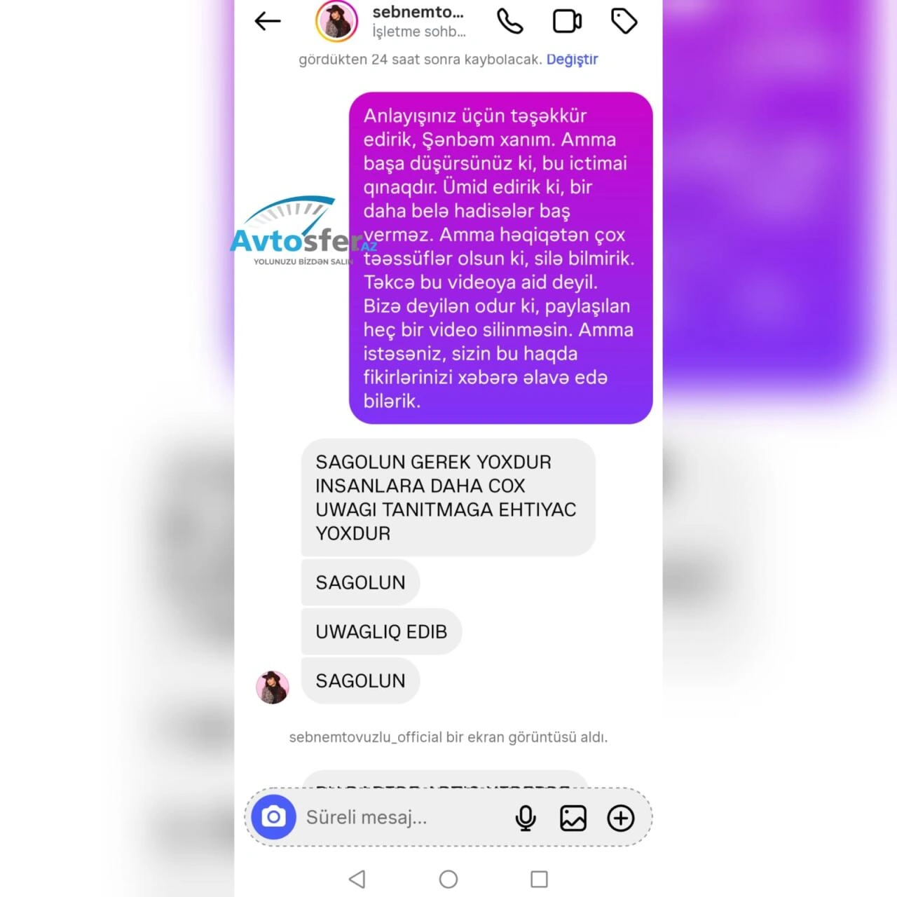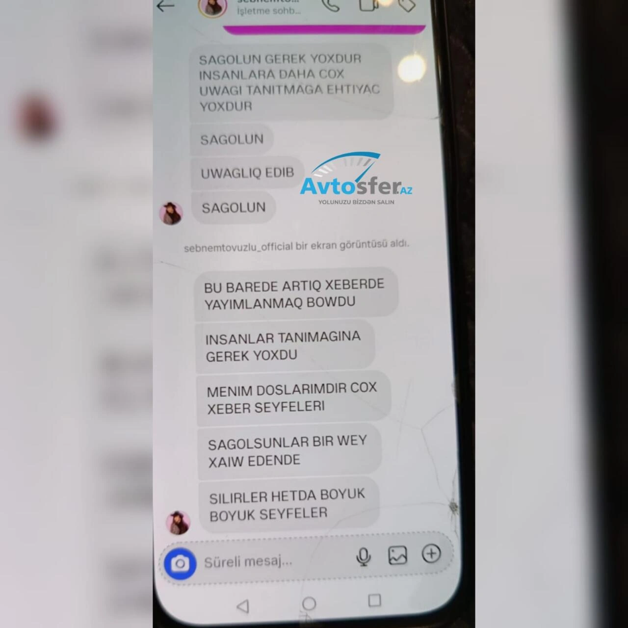 Bunun ardınca növbəti mesajlarda təhdid xarakterli ifadələrin yer aldığı görülüb. Mesajlarda səhifənin bağlatdırılacağı ilə bağlı fikirlər səsləndirildiyi, eləcə də "Instagram səhifəm daha böyükdür, belə kiçik səhifələri bağlatmaq mənim üçün çətin deyil" məzmunlu sözlərin yazıldığı bildirilir.