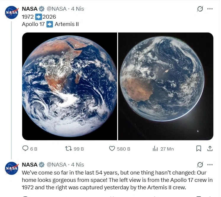 OLAY yazır ki, kosmik agentliyin paylaşımında “Apollo 17” missiyasının heyəti tərəfindən çəkilmiş məşhur Yer fotosu ilə 2026-cı ildə “Artemis II” astronavtlarının çəkdiyi yeni görüntü yanaşı təqdim olunub.