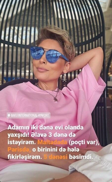 "Adamın iki dənə evi olanda yaxşıdır. Əlavə 3 dənə də istəyirəm. Maltada (demək olar ki, var), Parisdə, o birini də hələ fikirləşirəm. 5 dənəsi bəsimdir".